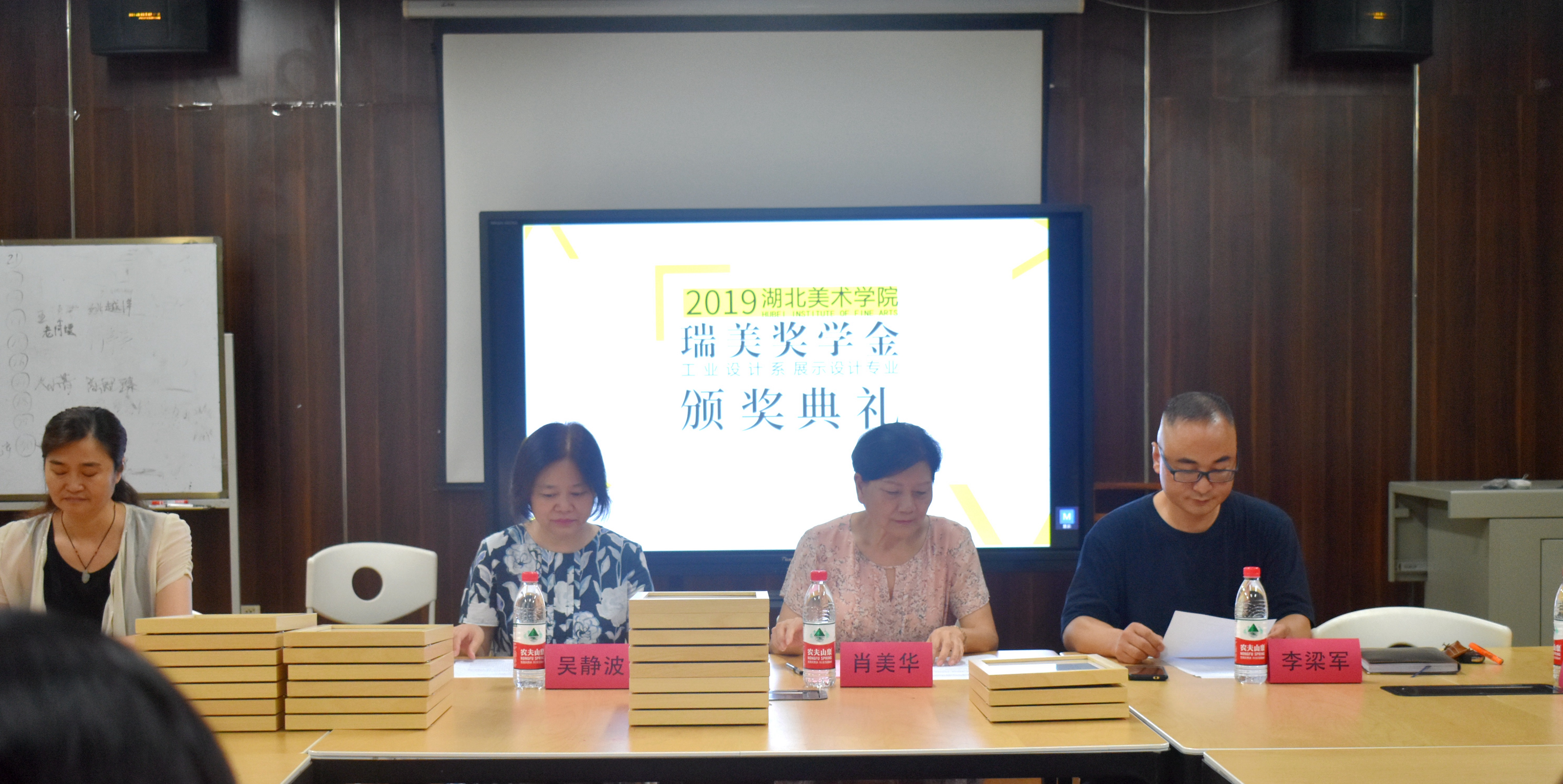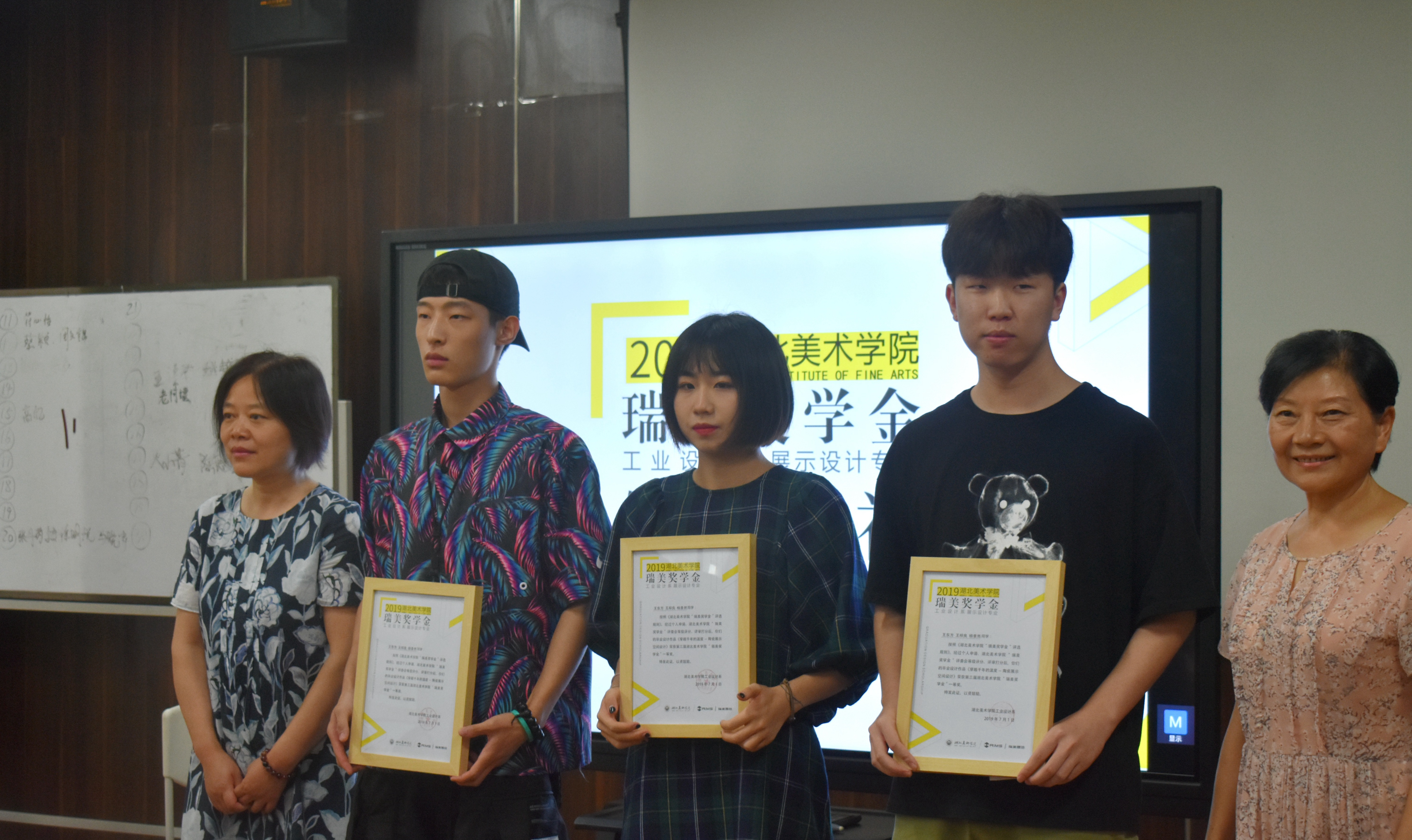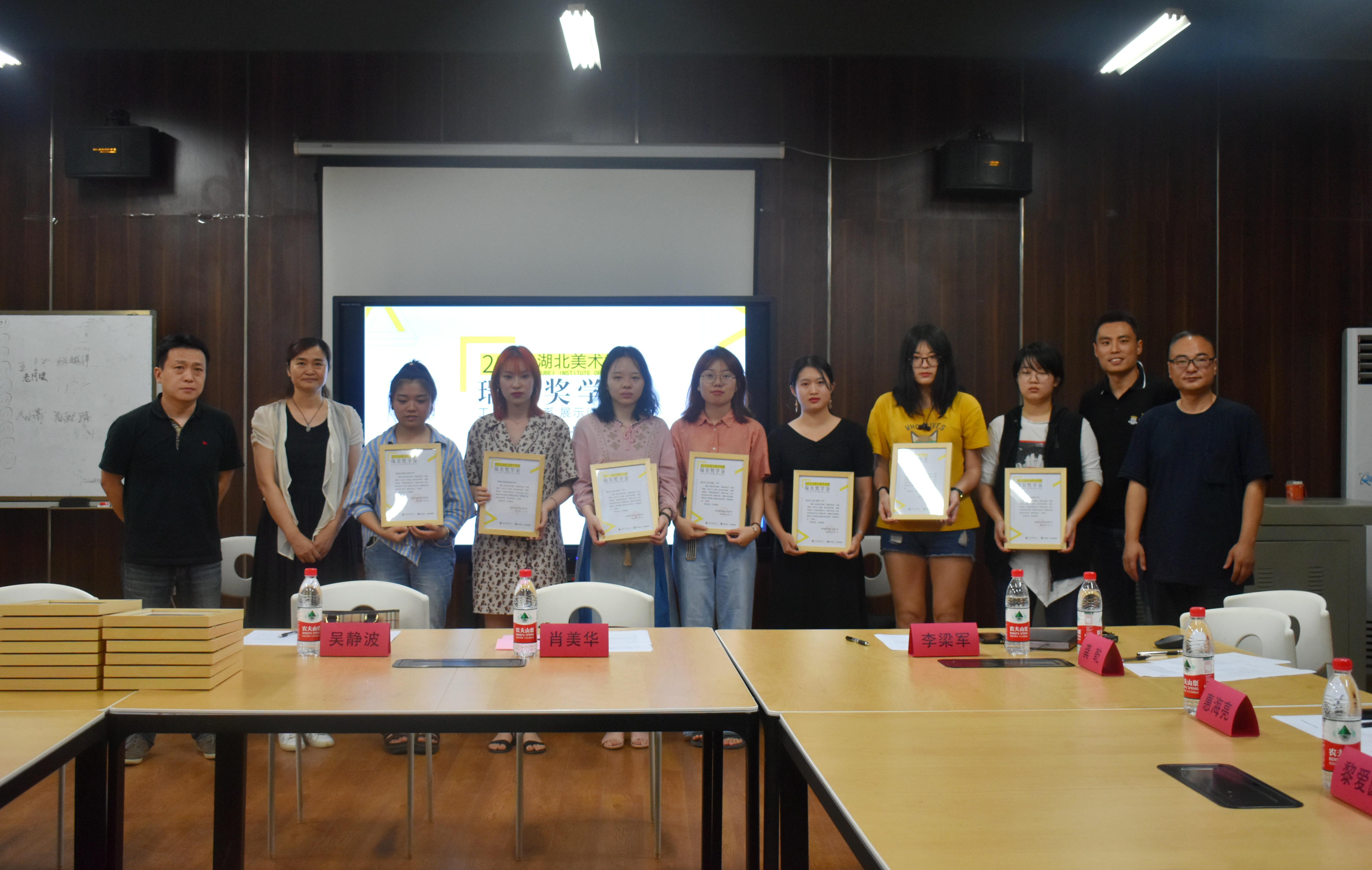 湖北美术学院总会计师吴静波、学生工作部部长袁首骥、教务处副处长袁秀娟、工业设计系党总支书记邓文清、系主任李梁军、工业设计教研室主任王康、教师代表赵凌与武汉瑞美展览有限公司领导们一同为获奖同学们颁奖。