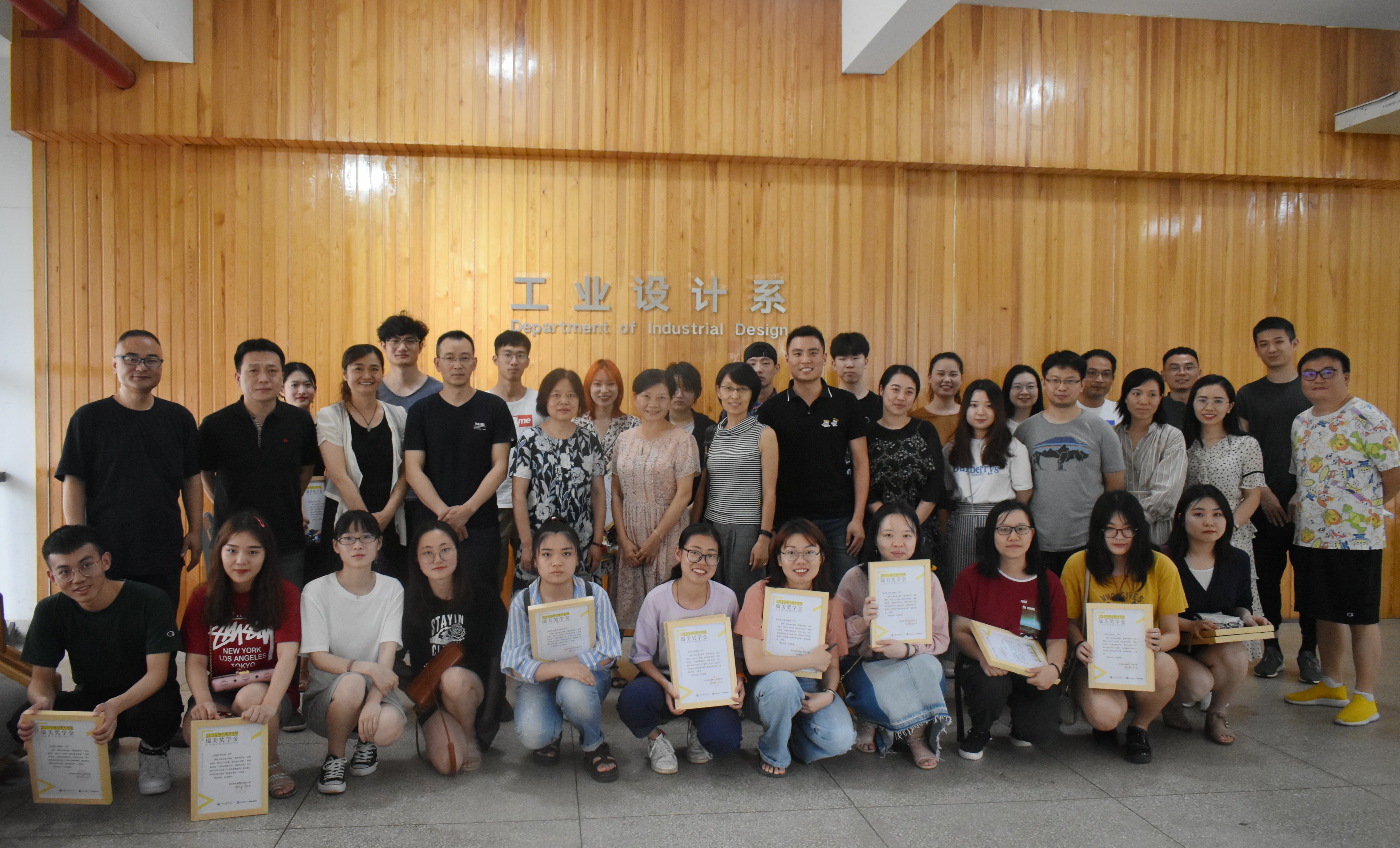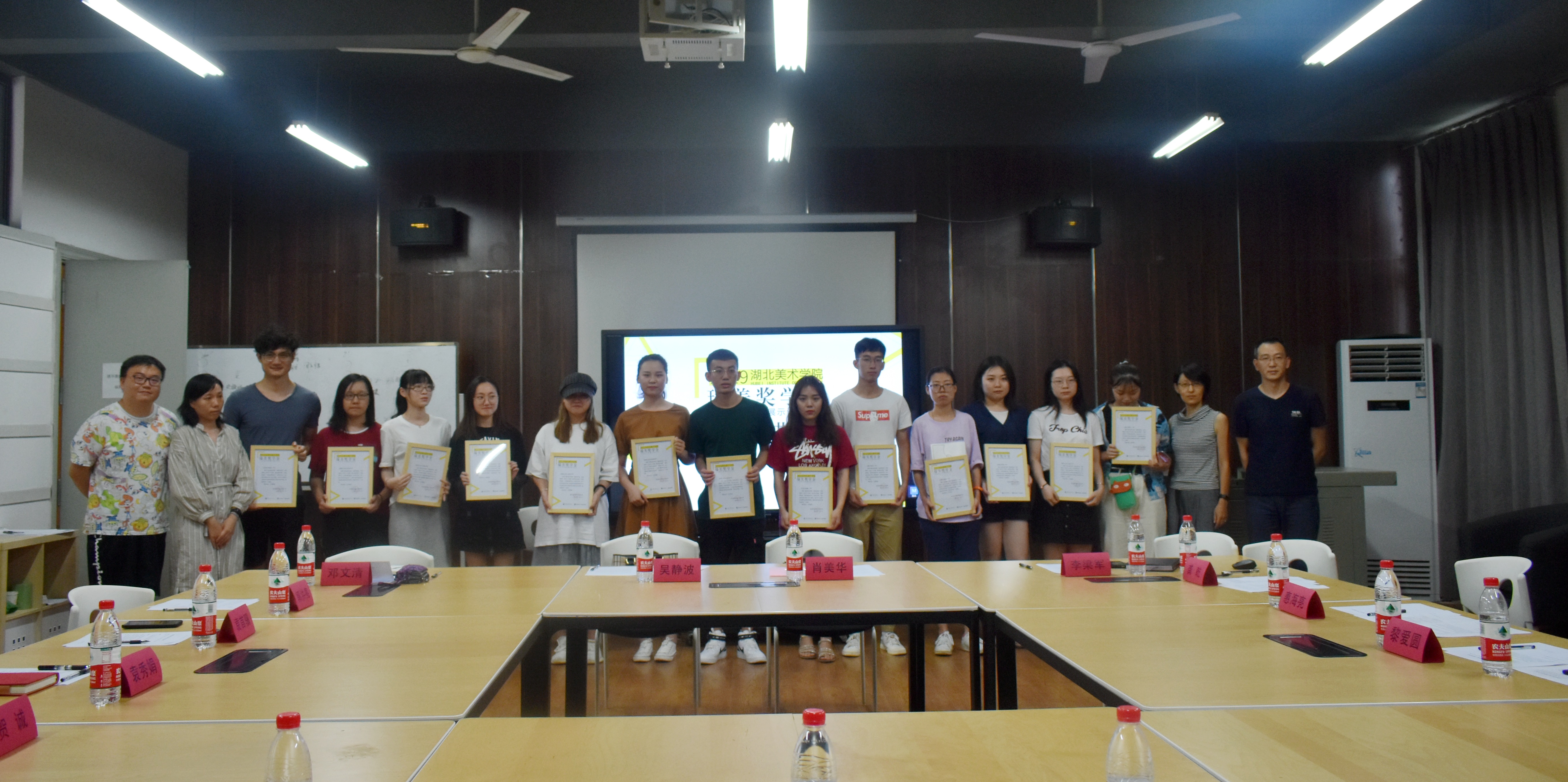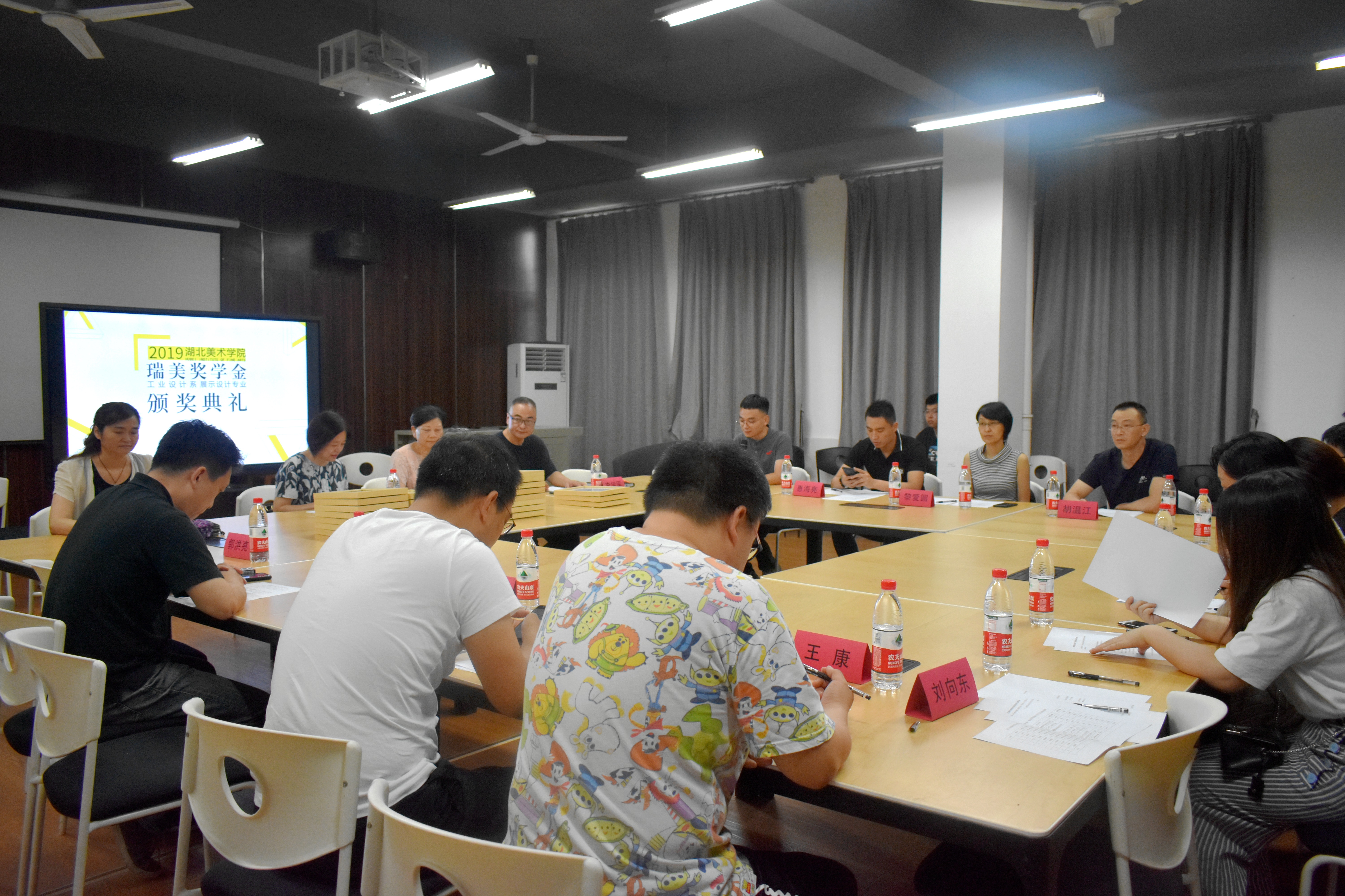 湖北美术学院总会计师吴静波、学生工作部部长袁首骥、教务处副处长袁秀娟、工业设计系党总支书记邓文清、系主任李梁军、工业设计教研室主任王康、教师代表赵凌与武汉瑞美展览有限公司领导们一同为获奖同学们颁奖。