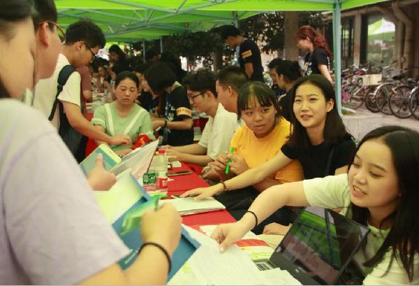 早上6:30,学生会的同学们已经来到迎新地点进行布置,半个小时后全部迎新队伍便已全部到齐“严阵以待”。系学生会、分团委成员们负责发放新生资料袋、学费收据单、军训资料单等资料,并积极仔细地向新生们介绍报道流程。还有部分同学因场地有限一直默默地站在旁边等待着新同学办理完手续便带领他们去往宿舍区,由于宿舍较远,搬行李的同学们都相当辛苦,一天结束平均每人下来来回跑了七八趟。当问起他们累不累时,他们都说:累是累,但挺有意义的,看着家长和新同学们满怀感激的笑容,痛并快乐着就是了。还有的说:我们去年就是有学长学姐接的,那时很感动,现在我们成了学长学姐,接新生是我们义不容辞的责任。在大家整理好资料并将现场打扫干净后,辅导员吴老师带领着部分学生会成员进行查寝工作。吴老师进入每间寝室与新生见面,告知大家一些注意事项;学生会成员们也配合着进行宣传工作,为学弟学妹答疑解惑。