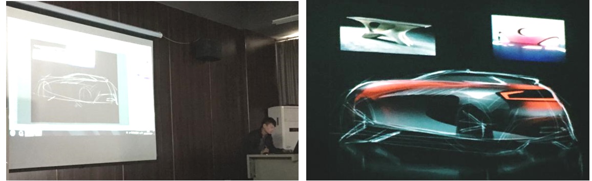 随后,外饰造型创意设计师樊明山通过PhotoShop软件,现场演示汽车草图绘制及效果图渲染的表达方法,手法精炼,在短短的十分钟时间就完成一辆SUV的基本形体绘制渲染,并在为同学们的演示过程中详细的讲解绘图技法和绘图中常出现的问题以及解决方法。