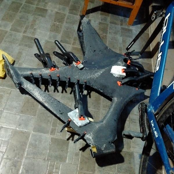 进行了简单的定点,插入五通,锯出尾叉。然后给链条经过的地方开出路来 并用碳布补好。然后花了2星期去制作坐垫,不断的翻模,真空,翻模真空,最后得到了贴合自己臀部的理想型态。