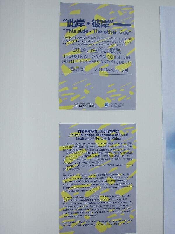 2014年5月9日,湖北美术学院工业设计系与林肯大学艺术与设计学院两校师生作品交流展在英国林肯大学开展!展览共计展出湖北美术学院工业设计系师生30余件作品,作品受到林肯大学艺术与设计学院师生的一致好评。为期三周的展览结束之后,所有作品将移至林肯大学展厅二层永久展厅继续展览一年,以促进湖北美术学院工业设计系与林肯大学之间的相互了解及学术交流。5月12日,在林肯大学艺术与设计学院展厅还举办了与湖北美术学院工业设计系教师视频交流会议。林肯大学工业设计系教授Dave,Stewart,艺术与设计学院院长等参加了此次视频会议。他们对此次展览和湖北美术学院工业设计系的师生作品给予了高度评价,双方非常友好与热情地进行了交流和会谈,为两校今后的进一步交流与合作奠定了良好的基础。6月份,林肯大学师生作品将在工业设计系开展。
