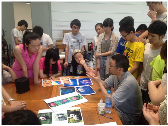 在接下来的几天,邱老师让学生自由组成小组,任意选择一组事物,再与学生一起探讨该事物的特点、寓于造型之中的情感要素,由此令学生获得了设计素材,再让学生用不同材质将自己小组的关键词用不同的材料表现出来。这样的教学方式令学生倍感新奇,动手动脑的积极性大增,也很好地锻炼了学生的团队合作能力。邱老师独到的见解,形象生动的讲解也令学生们印象深刻。
