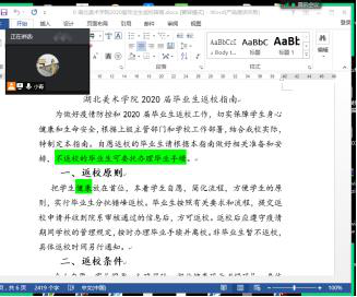 本次线上会议的开展主要向毕业生们阐述了返校和离校手续办理的流程。会议强调,在校期间,我系将把写生安全放在首位,本着学生自愿、简化流程、方便学生的原则,实行毕业生分批错峰返校,并严格要求返校毕业生遵循个人自愿、家长同意、知晓风险、湖北健康码为“绿码”、身体健康无异常情况、核酸检测结果为阴性、承诺严格遵守疫情防控相关要求等七项条件。