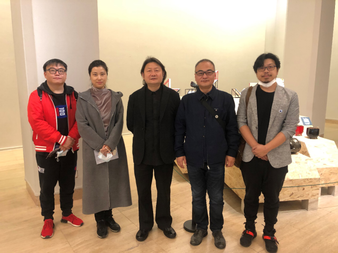 西安美术学院院长朱尽辉教授、科研处处长刘晨晨教授与工业设计系教师在工业设计系展台前合影留念