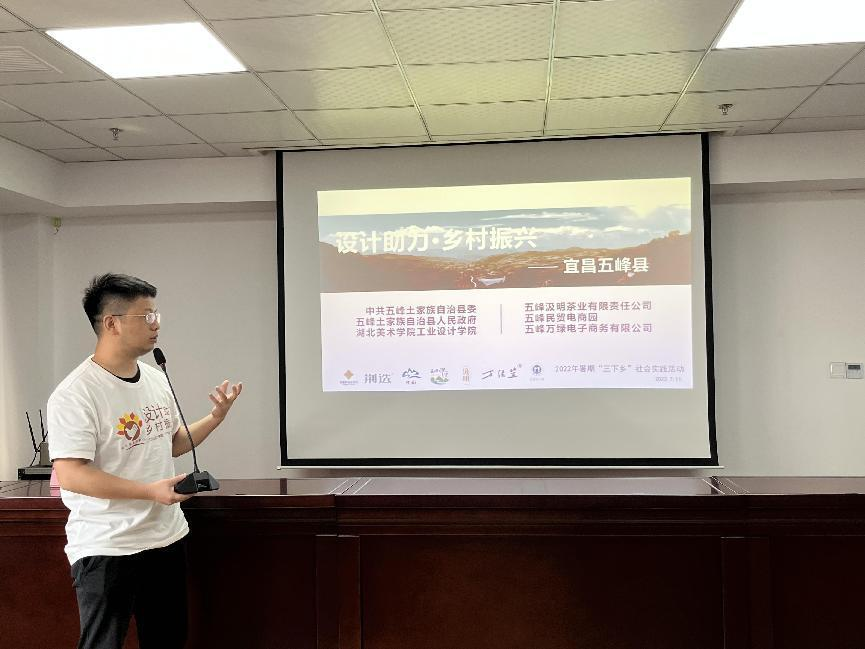 7月11日上午,工业设计学院“设计助力乡村振兴”暑期社会实践成果展示会在五峰万绿电子商务有限公司会议室举行。五峰县人民政府副县长严亮同志、工业设计学院院长助理杨艺副教授、五峰县政府办、文化旅游局相关负责人、五峰县企业家代表以及工业设计学院社会实践服务队全体师生参加本次成果展示会。成果展示会由我校驻洞口村第一书记黄晓仑主持。