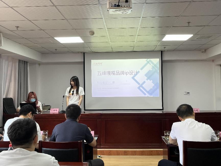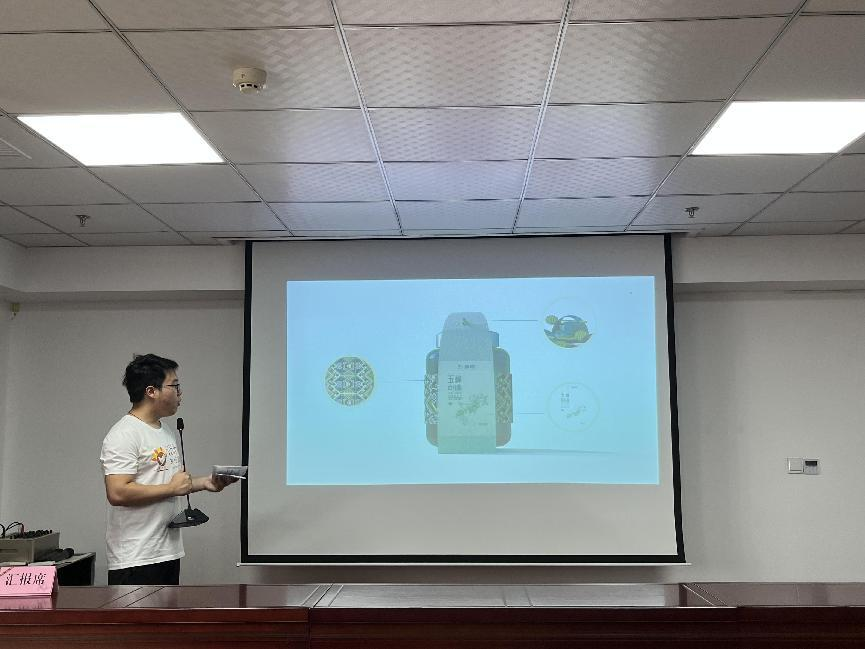 会议伊始,小组代表胡清雅、谌异辰、刘一恒依次对五峰民贸电商园、五峰汲明茶叶有限责任公司、五峰万绿电子商务有限公司的设计方案进行汇报。三组设计人员针对企业的实际需求,结合五峰当地特色文化,分别介绍了各自的设计灵感来源,制定符合企业特色的设计方案,并作最终的效果展示。