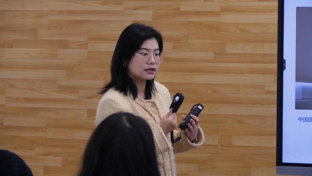 讲座期间杨凌燕指导学生分组进行测光体验,通过具体的案例向学生解释了什么是光环境,以及光环境对展示设计的重要性和对设计师提出的要求。生动且详细地介绍了普通照明、局部与整体结合的照明、重点突出的照明、辅助装饰的照明等照明方式,以及光源性能和灯具选型。