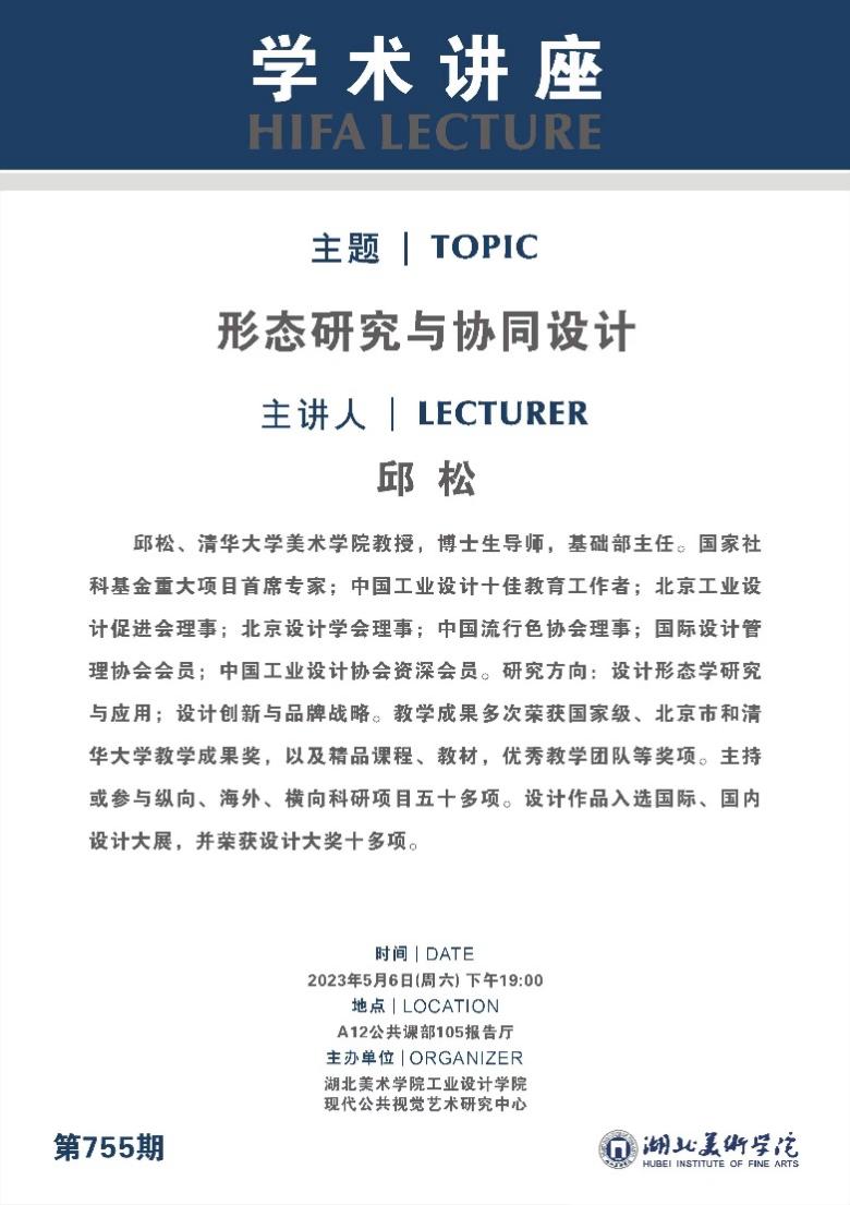 2023年5月6日,在湖北美术学院藏龙岛校区A12-105报告厅,清华大学美术学院邱松教授为我校师生带来一场题为《形态研究与协同创新设计》的精彩讲座。讲座由工业设计学院副院长张锐主持,学校教师代表及学生约一百余人参加了本次讲座交流活动。