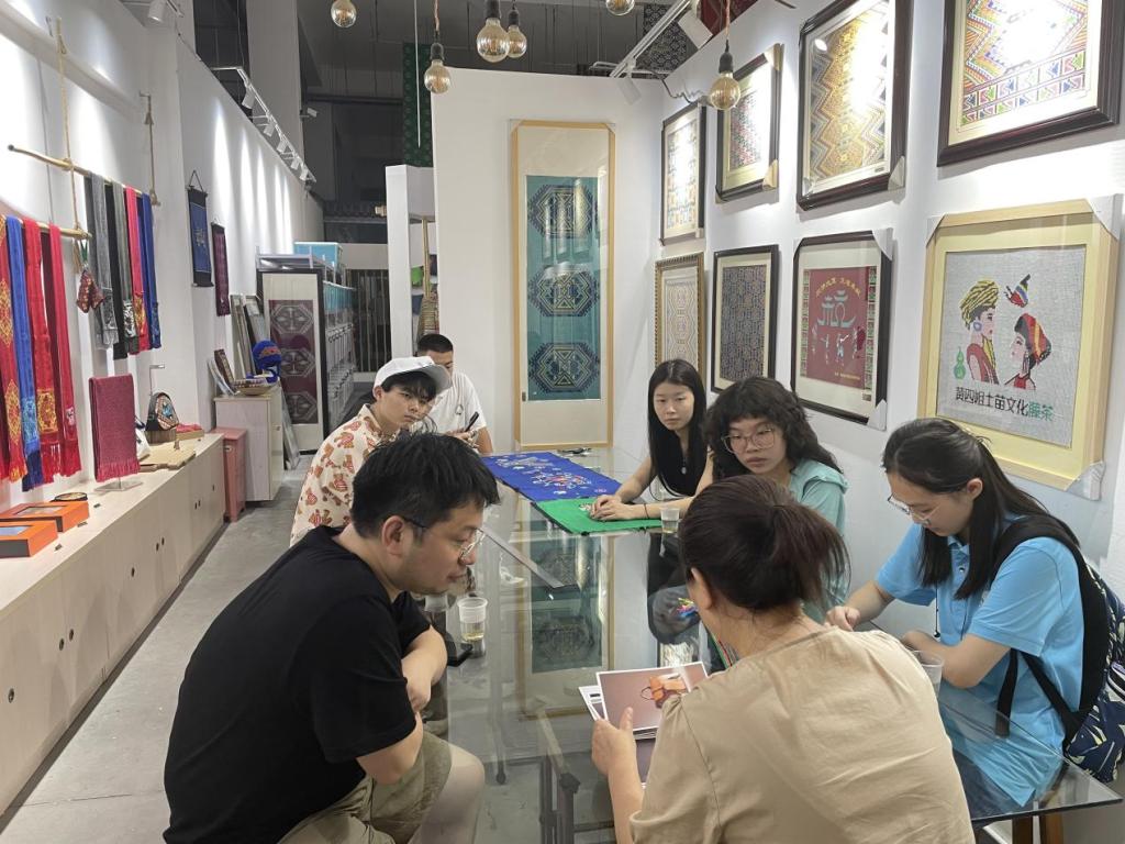 在来到该公司位于市区和宣恩县麻阳寨的研学基地后,通过实地参观、与传承人座谈、亲自体验织绣技术,团队成员感受到了西兰卡普的历史渊源、美学特点、精湛工艺和艺术魅力。团队成员立足特定群体的消费心理和习惯,结合西兰卡普的文化特点,确定了产品设计方案。指导老师在非遗传承人田若兰的陪同下参观了乡镇部分景点,就乡村文化艺术建设进行交流。期间,校领导张以林、程智力看望慰问了团队成员并提出了工作期望。