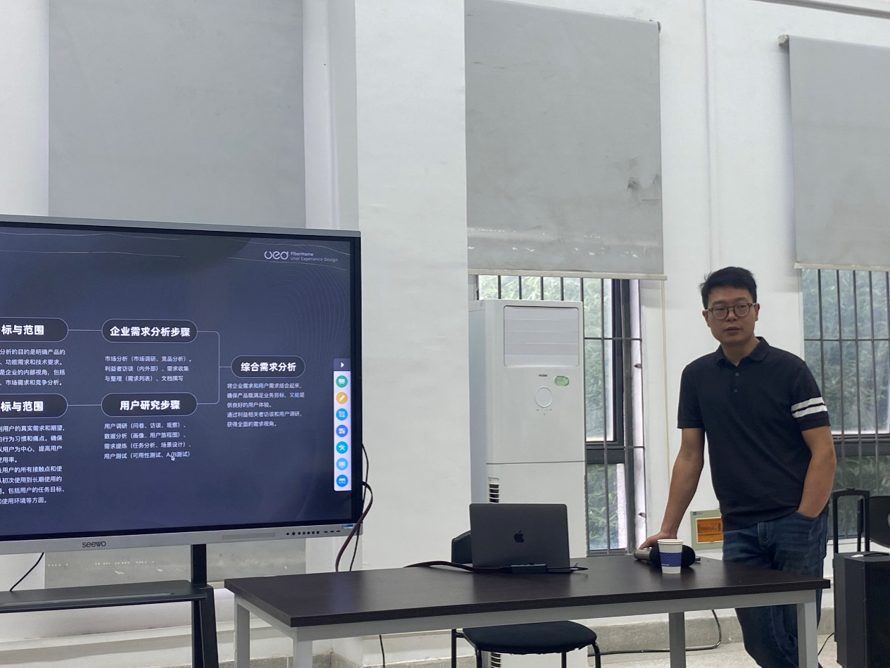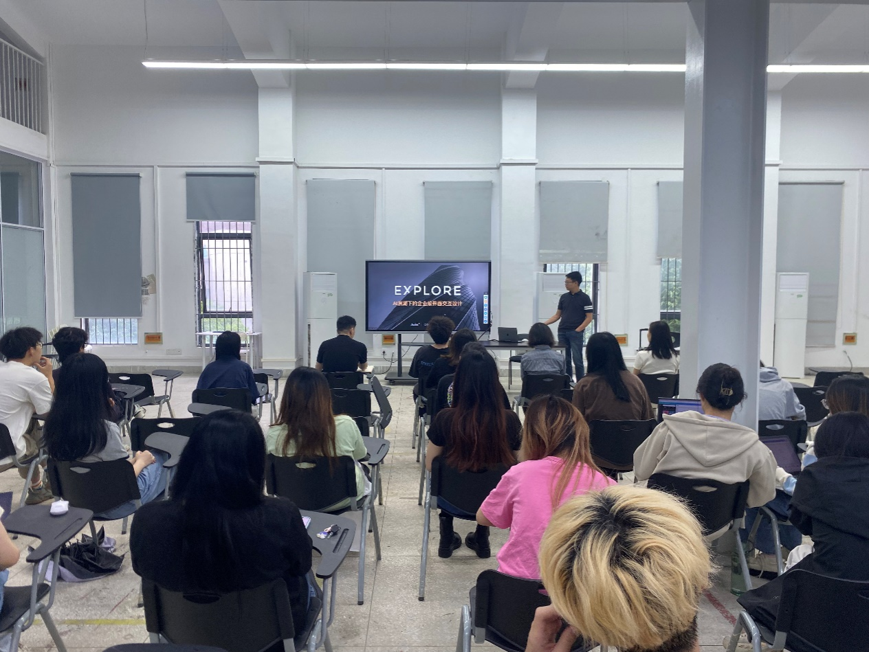 会上,李奕老师首先对马腾飞先生的到来表示了热烈的欢迎,并向与会师生简要介绍了马腾飞先生在交互领域的成就和贡献。随后,马腾飞先生从烽火公司的UED项目经历,企业级界面交互的变革,企业设计流程,AI带来的挑战和机遇等多个方面,深入浅出地与大家进行了交流。他强调,他深入剖析了在 AI 浪潮席卷的当下,企业界面交互设计所面临的机遇与挑战。通过生动的案例和精彩的讲解,阐述了如何更好地利用 AI 技术提升界面交互的效率和用户体验。