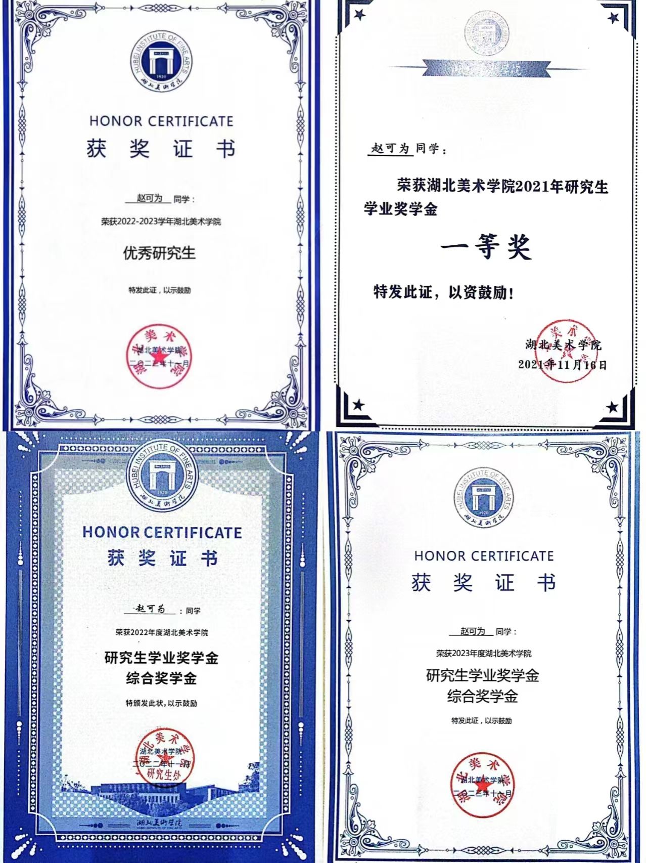 赵可为同学积极参与校内外各种学科竞赛,以优异的成绩屡获殊荣。曾获第十四届“挑战杯”大学生课外学术科技作品竞赛三等奖;2021-2022全国插画双年展铜奖;湖北高校第九届美术与设计大赛入选;KTK靳埭强全球华人设计比赛入选;联合国教科文组织全球未来教育设计大赛优秀奖;香港当代设计奖铜奖;上海徐汇区政府元宇宙设计创意大赛入选奖;获湖北美术学院档案馆设计大赛一等奖;湖北美术学院百年校庆大赛三等奖;中国传统文化复兴之二十四节气创作展入选。这些荣誉不仅是对他个人努力的肯定,也为学校争得了荣誉。在备赛过程中,赵可为展现出了高度的团队合作精神和卓越的解决问题的能力,不仅提升了自己的专业技能,也积累了宝贵的竞赛经验。