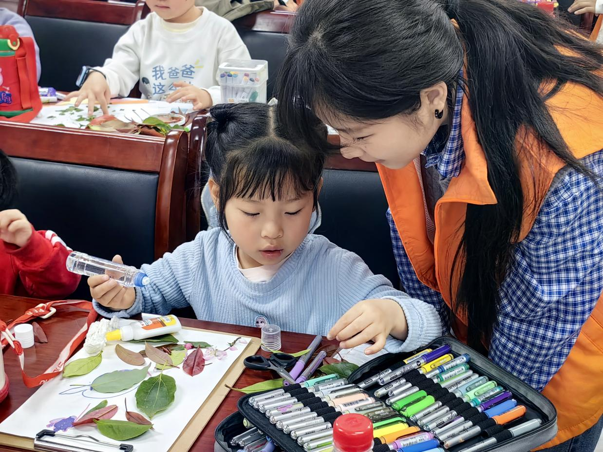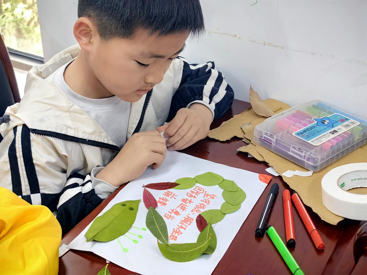 在“艺绘大别山”环节,宣讲团员带领现场儿童及家长共同创作"大别山风貌长卷"。以大别山相关植物标本,结合拼贴与拓印再现"红色行军线"地形图;用社区废旧材料制作"支前独轮车"立体拼贴画;将鹅掌楸叶片拓染为"信念之舟"图案......让大别山精神力量在色谱叠染间具象化,诠释"绿水青山蕴藏红色基因"的深刻内涵。