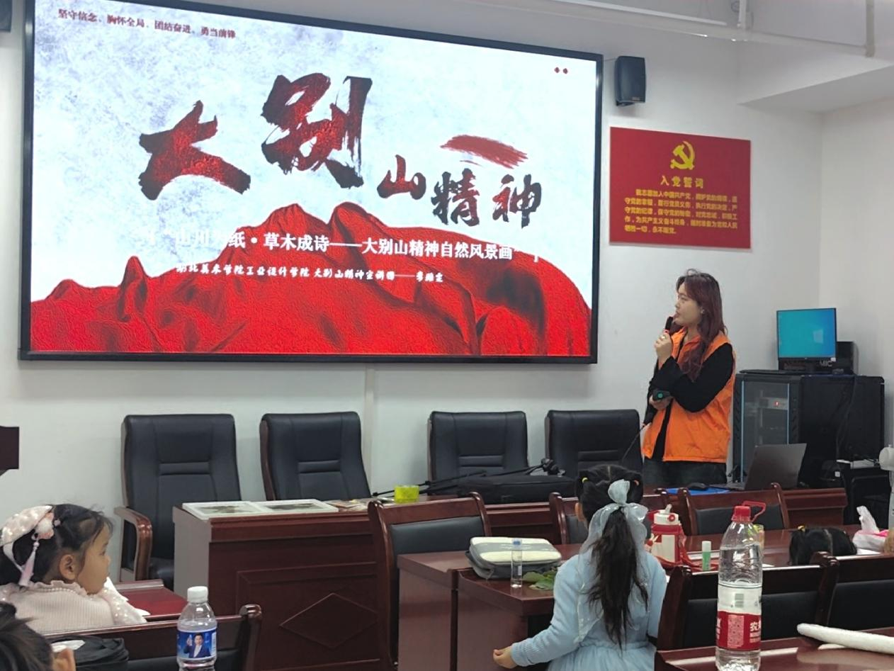在“艺颂大别山”环节,宣讲团成员李雅雯以扣人心弦的大别山红色故事为引,通过视频展示“二十八载红旗不倒”的大别山革命传奇,带领孩子们“回溯”至那段战火纷飞却又满溢热血温情的峥嵘往昔,“大小朋友”共同感悟“坚守信念、胸怀全局、团结一心、勇当前锋”的大别山精神内涵。