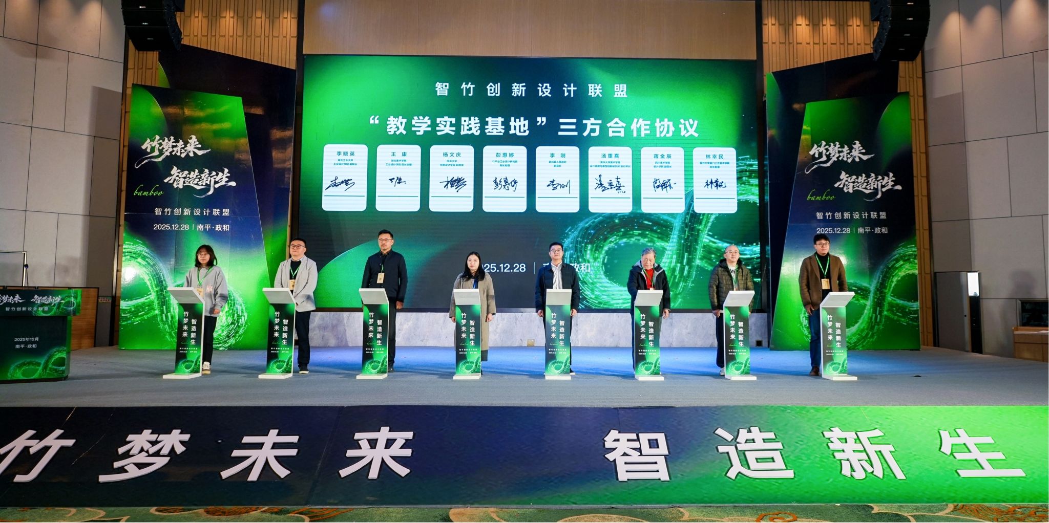活动期间,政和县人民政府、竹产业工业设计研究院与清华大学设计战略与原型创新研究所、同济大学创意设计学院、英国上市公司365、四川美术学院设计学院、福州大学厦门工艺美术学院、湖北工业大学工业设计学院等高校签署共建“教学实践基地”三方合作协议,打通人才培育与产业需求通道。