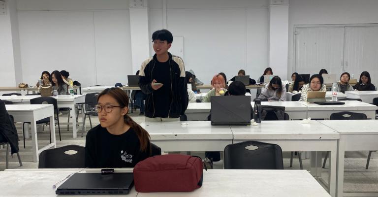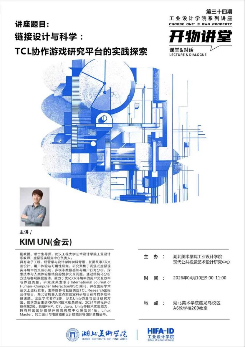 4月10日,工业设计学院邀请韩国知名设计学者金云(Kim un)教授莅临湖北美术学院,为师生带来“开物讲堂”第三十四期《链接设计与科学:TCL协作游戏研究平台的实践探索》专题学术讲座。本次讲座聚焦数字时代设计与科学的深度融合,结合 TCL MineX World 沉浸式主题乐园虚拟世界等前沿项目,为师生们分享了游戏设计、交互体验与人工智能技术结 合的最新研究成果与实践经验。学院专业教师、产品设计专业学生参加了本次学术活动。本次讲座由院长助理黄双君主持。