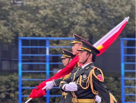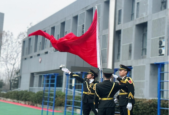 迎着清晨的第一缕阳光,伴随着嘹亮的口号声,学校国旗护卫队队员,身着礼服、昂首挺胸,踏着铿锵的步伐、走着整齐的队列,在全体师生的注目下走到主席台前。护卫队旗手奋力挥动右臂,将鲜艳的五星红旗抛向空中,《义勇军进行曲》响彻学校田径场,全场师生注视着国旗缓缓升至旗杆顶端,眼神中满是敬畏与自豪。