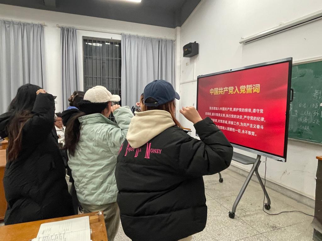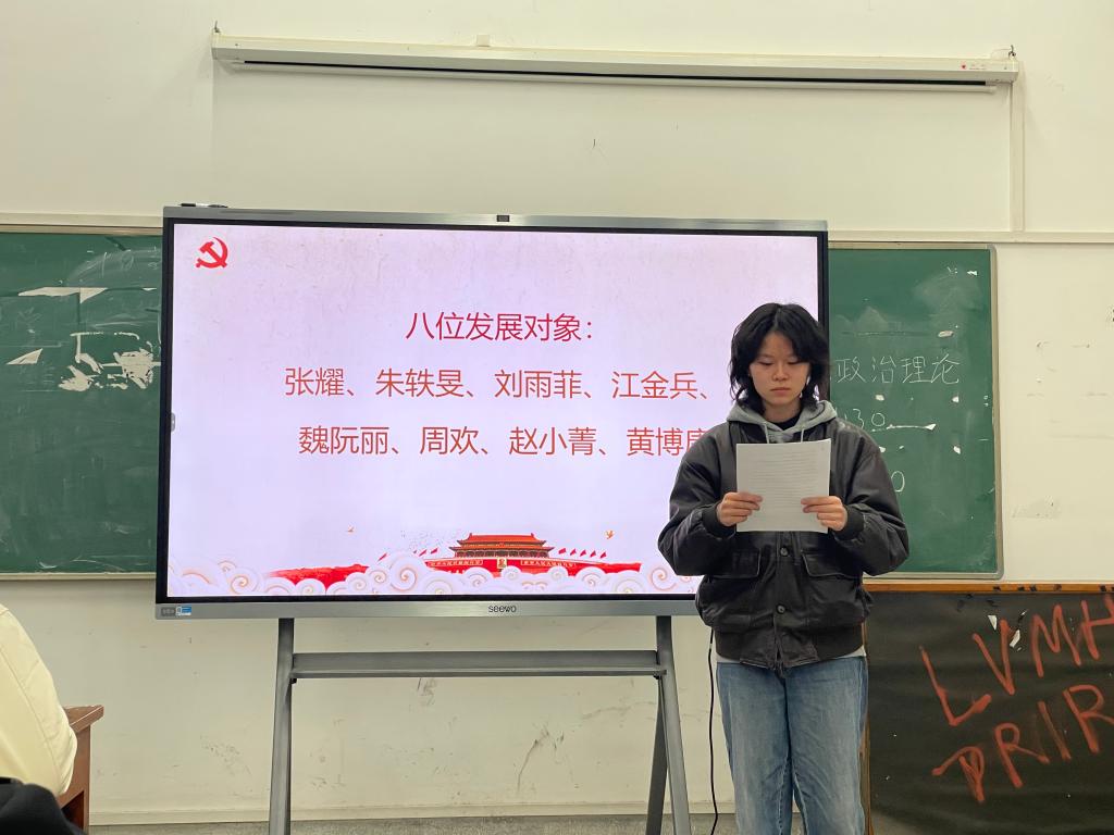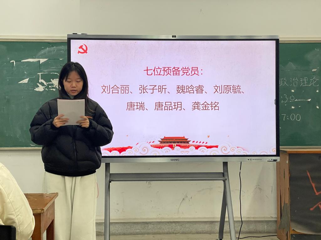 会议首先进行预备党员接收。经过党支部严格考察和培养,本学期共8名同志被列为发展对象。8名同志依次对自己一年来的表现进行汇报,随后入党介绍人分别介绍发展对象的培养考察情况并表明意见,支委会汇报审查情况,接着由全体正式党员对上述8名发展对象依次进行无记名投票表决,表决结果全票通过。最后江金兵、朱轶旻、张耀、赵小菁、周欢、黄博康、魏阮丽、刘雨菲被学生第一党支部接收为中共预备党员。