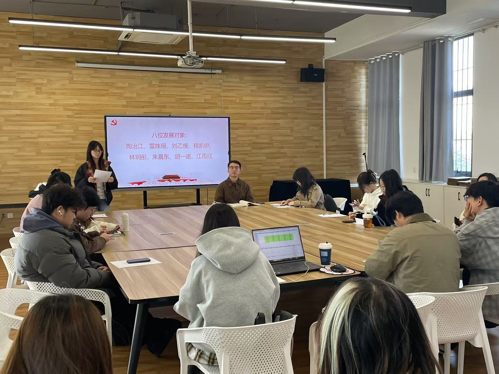 经过党支部严格考察和培养,本学期共8名同志被列为发展对象,会议逐一对其进行讨论表决。8位同志依次汇报自己现实表现等情况,入党介绍人介绍情况并就能否入党表明意见、支委会汇报审查情况、与会党员发表意见、全体正式党员进行无记名投票表决。会议决定接收陶治江、雷姝瑶、刘乙慢、程凯伊、林玥彤、朱晨东、胡一诺、江雨欣为中共预备党员。