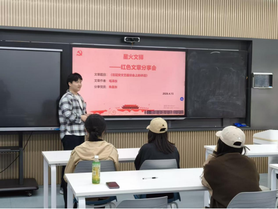 朱晨东分享了毛泽东同志经典著作《在延安文艺座谈会上的讲话》,他系统梳理了讲话的历史背景与核心要义,重点阐释了“文艺为人民服务”的根本方向,号召同学们作为设计专业学子,要将创作扎根人民需求、服务社会发展,以有温度、有深度的设计作品回应时代召唤。
