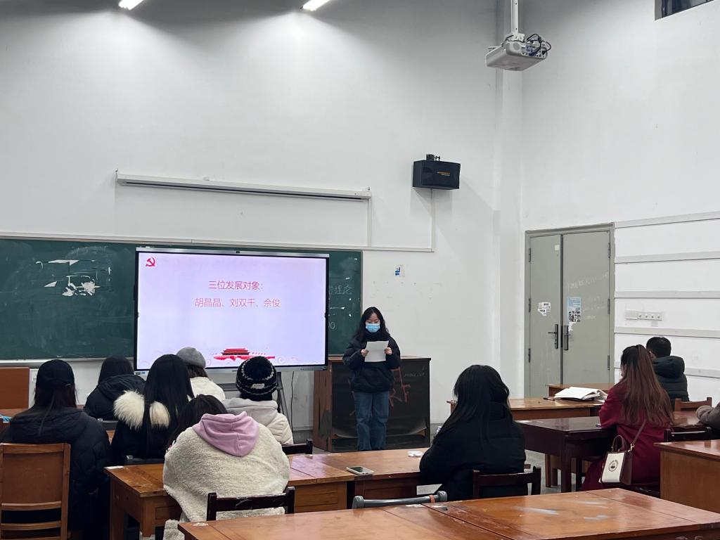 经过党支部严格考察和培养,本学期共3名同志被列为发展对象。3名同志依次对自己一年来的表现进行汇报,随后入党介绍人分别介绍发展对象的培养考察情况并表明意见,支委会汇报审查情况,接着由全体正式党员对上述3名发展对象依次进行无记名投票表决,表决结果全票通过。最后胡晶晶、刘双千、佘俊被学生第二党支部接收为中共预备党员。