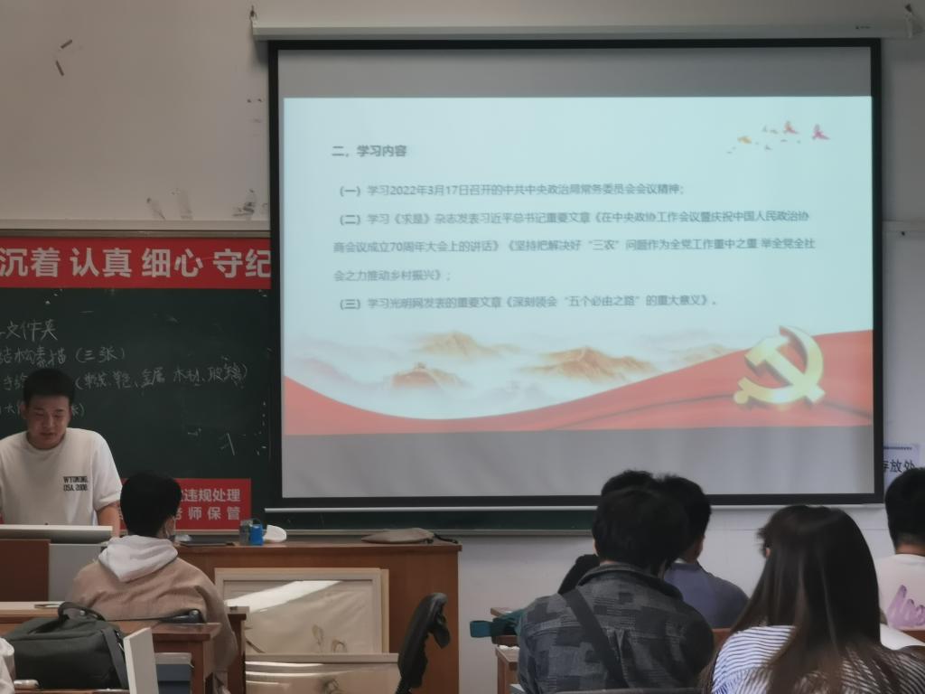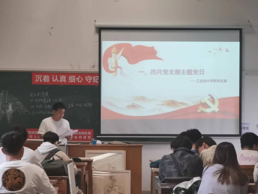 工业设计学院学生第一、第二党支部于2022年4月22日在A6教学楼310教室进行四月支部主题党日会议。会议由第一党支部段飞飞同志主持,党支部全体党员,预备党员到场参与。