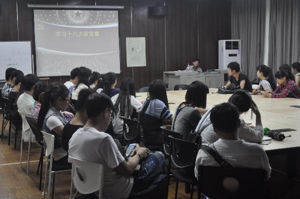 讲座开始,李老师以上周我系党总支组织学生党员参观中共五大会址为切入点,介绍了此次讲座主要从“党章概述”、“历届党章回顾”、“解读新党章”和“如何学习党章”四个方面展开。李老师带领大家重点学习了“历届党章回顾”和“解读新党章”,特别指出了 中国共产党第十八次全国代表大会对中国共产党章程进行了修改,把科学发展观同马克思列宁主义、毛泽东思想、邓小平理论、“三个代表”重要思想一道确立为党的行动指南,实现了党的指导思想又一次与时俱进,这是坚持用马克思主义中国化最新成果指导新的实践的必然要求,是全党全国各族人民的共同心愿。我们需要认真学习领会党的十八大党章修正案关于党的指导思想的新发展,进一步增强用科学理论武装头脑的自觉性和坚定性,号召大家认真研读原文,深刻领会。