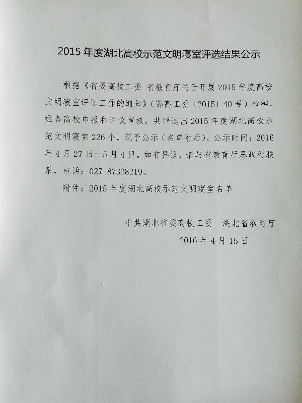 新闻网讯 近日,中共湖北省委高校工委、湖北省教育厅对2015年度湖北高校示范文明寝室评选结果进行了公示,根据《省委高校工委 省教育厅关于开展2015年度高校文明寝室评选工作的通知》(鄂高工委〔2015〕40号)精神,经各高校申报和评议审核,我校工业设计系2栋501寝室荣获“2015年度湖北高校示范文明寝室”称号。据悉,此次活动由中共湖北省委高校工委、省教育厅主办,涉及全省高校120多万大学生,遴选出200间省级高校示范文明寝室。