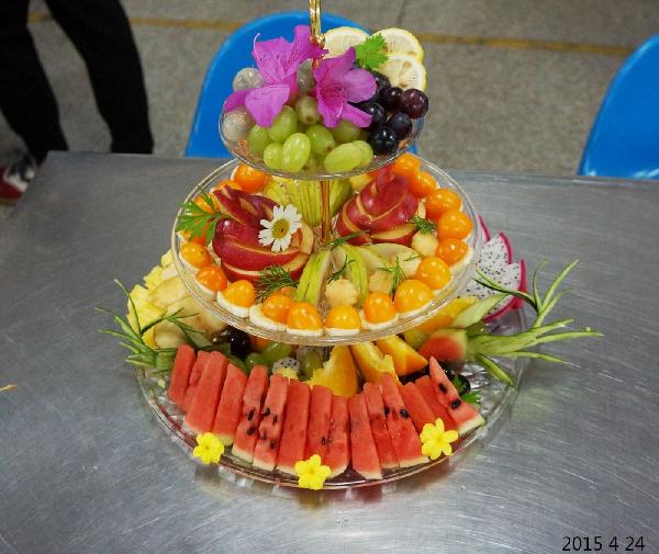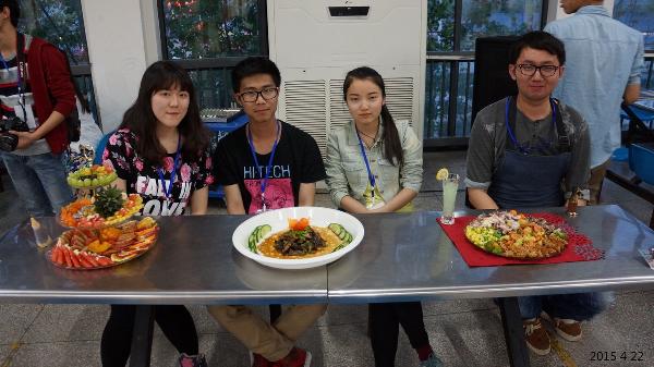 22日小组赛中,我系参赛者积极配合,共同完成了水果拼盘“花花皇宫”、主菜“亚特兰蒂斯”及配菜豆角烧茄子,以85.6分获小组赛第一的成绩成功晋级。24日总决赛中,选手们潜心研究、精心准备,三层华丽的水果拼盘,由泰式咖喱虾、黄金鱿鱼卷、炭烧鱿鱼须和鱼子酱组成了“四海一家”,由菲力牛排和龙利鱼柳组成“海陆双拼”更是创意十足。“切煮炒炸样样全,色香味美个个鲜”,在品尝过程中老师和学生代表赞不绝口,大家的努力得到了评委们的一致认可,这是对选手们最大的鼓励。