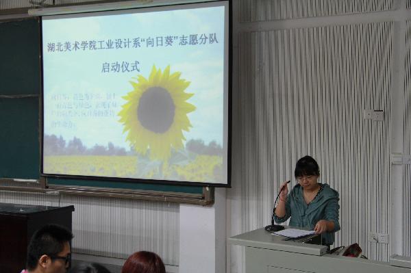 (通讯员 吴佳馨 记者 戴梦君)争做阳光志愿者,传递青春正能量。2013年9月26日12时30分湖北美术学院工业设计系“向日葵”志愿者分队启动仪式在A12-107教室举行。校团委郭书记出席并致辞,工业设计系辅导员李军老师参加。启动仪式由队长吴佳馨主持。