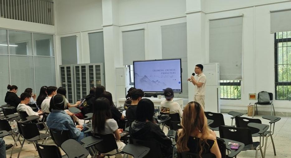 龚乾代表学院热情欢迎蒙古国留学生来访,并简要介绍了工业设计学院及展示设计专业相关信息与所获成果。随后,他以《CHARMING CHINESE CHARACTERS》(魅力中国汉字)为主题开展讲座,通过甲骨文中的“孝”(Filial Piety)、“礼”(Ritual)、“乐”(Music)、“编钟”(Chime Bells)四个汉字,生动阐释了中华孝道与礼乐文化的艺术承载方式,深入浅出地展现了中国传统文化精髓。
