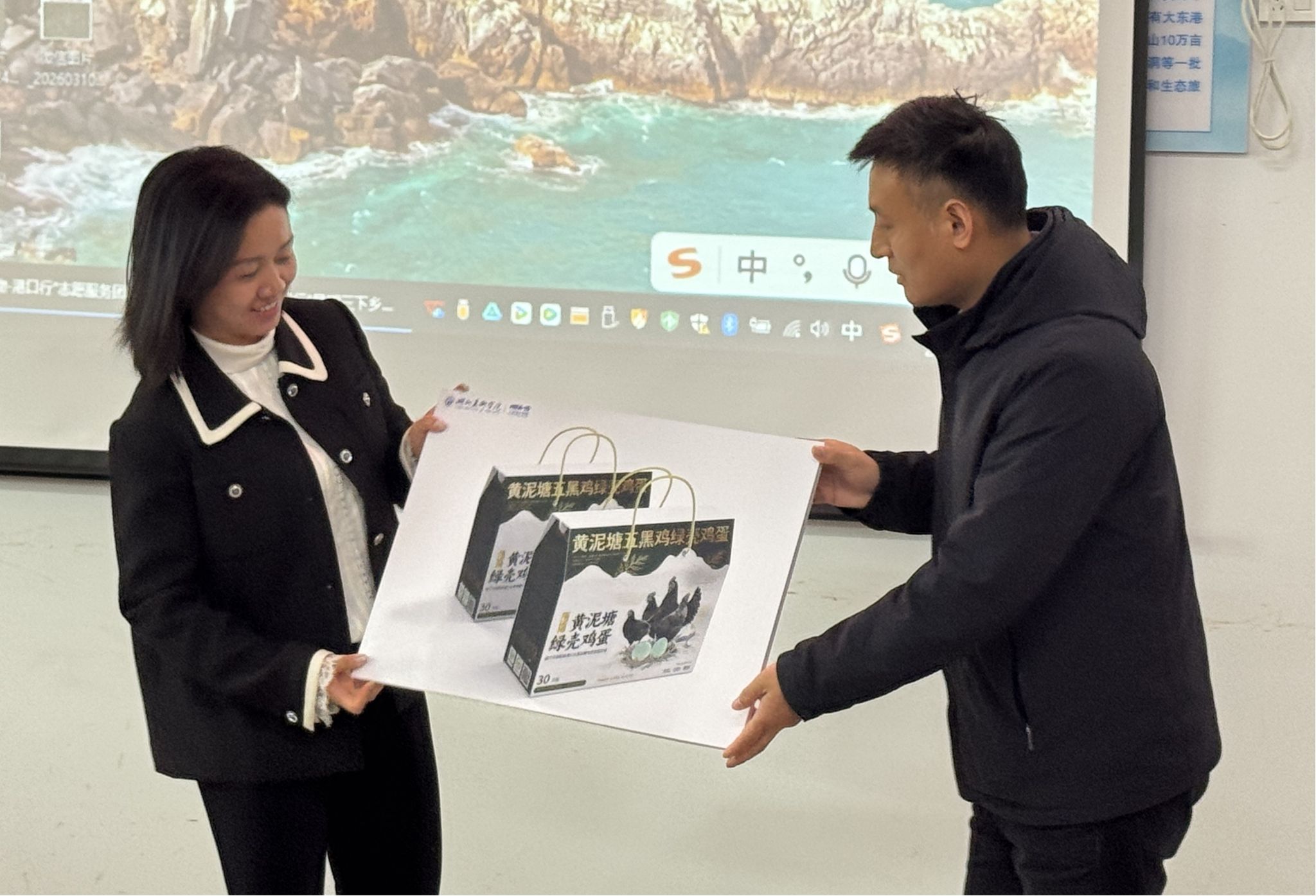 在与会人员的见证下,李军向港口乡正式移交黄泥塘生态养殖场鸡蛋包装设计成果。卢晓霞代表乡镇向学院赠送锦旗,并代表乡镇企业感谢设计团队以专业力量助力乡村农产品品牌发展。