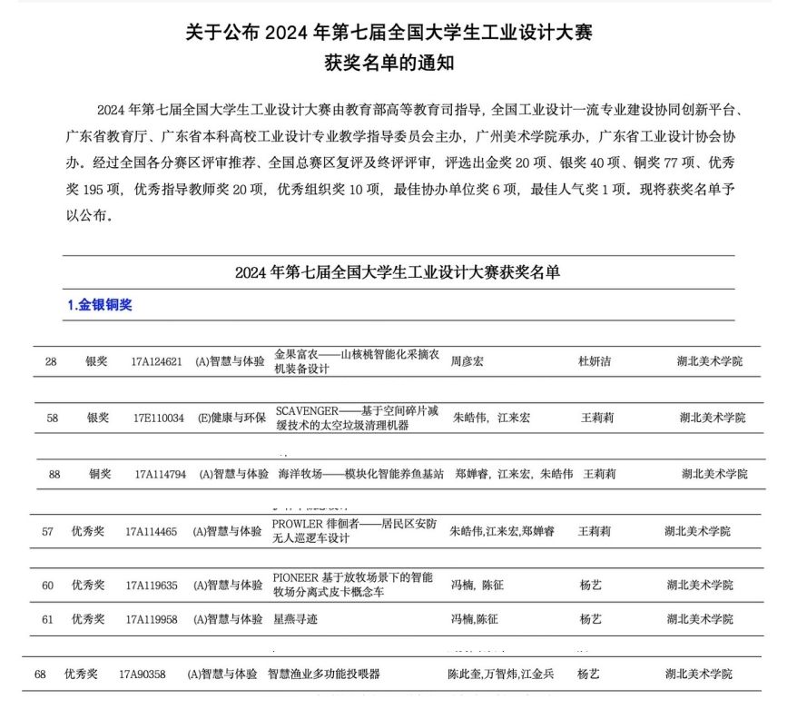 11月8日第七届全国大学生工业设计大赛颁奖典礼在广州美术学院举行。大赛由教育部高等教育司指导,全国工业设计一流专业建设协同创新平台广东省教育厅、广东省本科高校工业设计专业教学指导委员会主办。经过全国各分赛区评审推荐、全国总赛区复评及终评评审,公布最终获奖名单。工业设计学院积极组织,在杜妍洁、王莉莉、杨艺等教师的指导下,在大赛的全国终评环节中获得银奖2项、铜奖1项、优秀奖4项的优秀成绩。