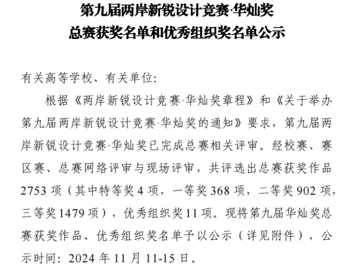 由中国高等教育学会举办的“第九届两岸新锐设计竞赛·华灿奖”,采用校赛、赛区赛、总赛三级赛制,共设立34个赛区。工业设计学院作为校赛的承办单位,积极组织作品的投稿与校赛评审,收获奖项颇丰。在省赛区赛中我校共获奖47项,工业设计学院获奖37项;在最终的全国总赛中我校共获奖14项,工业设计学院获奖8项。